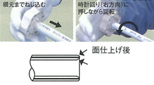 - 面仕上器を時計回り(右方向)に押しながら回転させると、管端の面仕上げと同時に偏平矯正もできます。