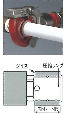 - メタキュットRED専用工具のダイス部が継手の圧縮リングのストレート部に入るように圧縮してください