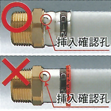 - 管を真っ直ぐ継手の奥まで、一気に挿入してください。奥まで挿入されていることを確認孔より目視で確認してください